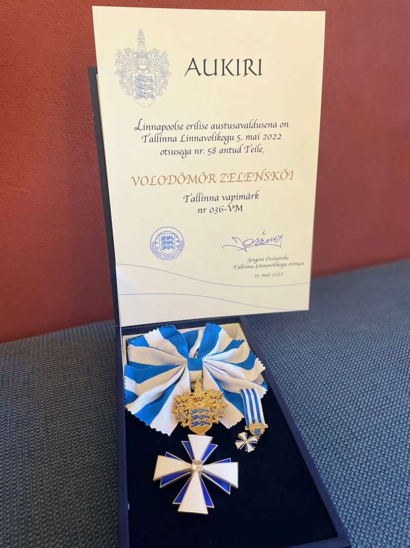 Довідково. Герб Таллінна — нагорода міста, яку вручають як особливу пошану. 5 травня міська рада Таллінна ухвалила рішення нагородити Президента України Володимира Зеленського відповідним Гербом.