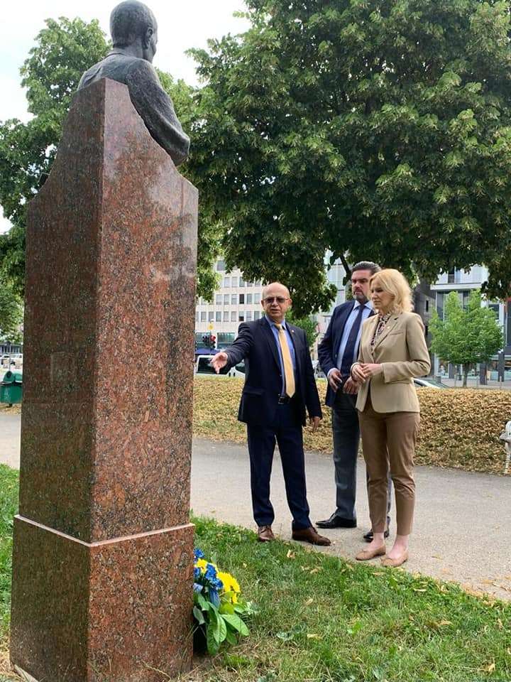 Заступниця Голови Верховної Ради України Олена Кондратюк розпочала робочий візит до Республіки Словенія з покладання квітів до пам’ятника Григорія Сковороди разом із Надзвичайним і Повноважним Послом України в Республіці Словенія Михайлом Бродовичем.