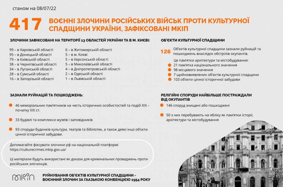 Станом на 8.07.2022 року, у МКІП зафіксували 417 воєнних злочинів російських військ проти культурної спадщини України. 126 об’єктів пам’яток архітектури та містобудування України зазнали руйнацій та пошкоджень унаслідок російських обстрілів. Постраждали від воєнних дій окупантів 196 релігійних споруд та 172 інші культурні будівлі.