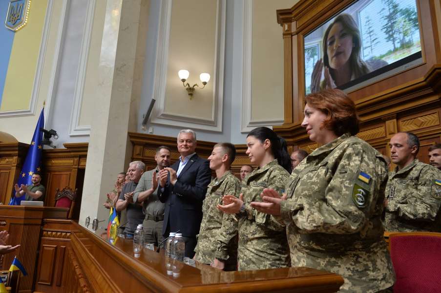 Друже Гітанасе Науседа! Шановний пане Президенте! Я хочу подякувати сьогодні тобі і в твоїй особі – усьому литовському народу у День нашої Державності за вагому важливу героїчну підтримку, яку отримала Україна. Дякую.