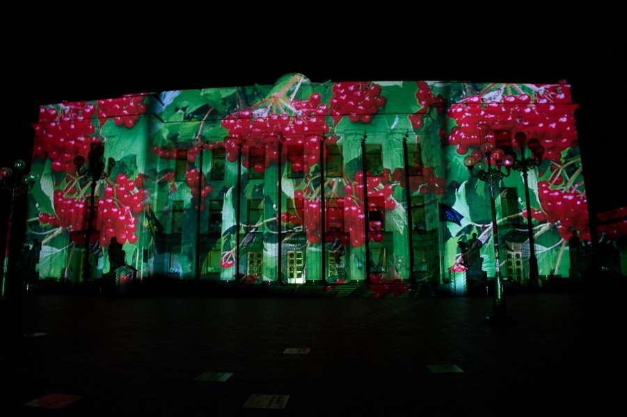 Художні проекції присвячені річниці повномасштабної війни в Україні та вшануванню пам'яті жертв російської агресії, а також відтворюють українські символи незламності.