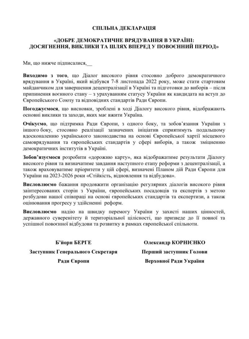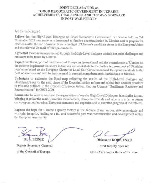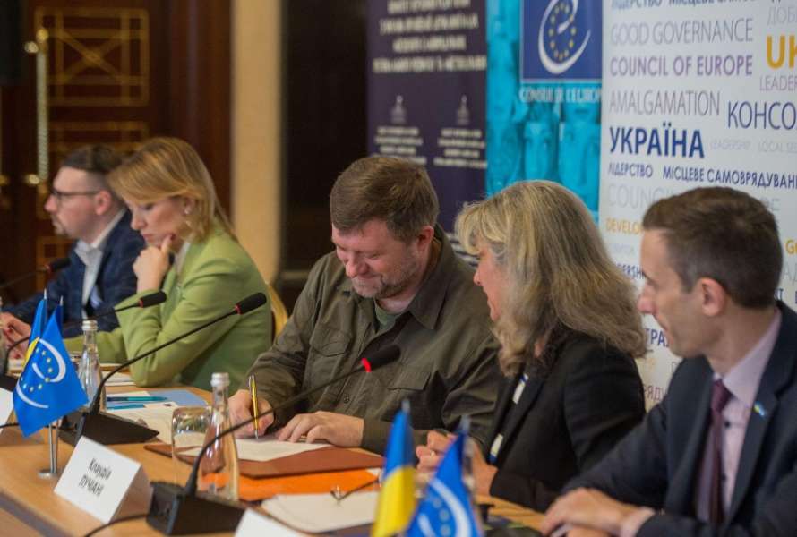 У межах заходу Україна та Рада Європи підписали Спільну декларацію щодо доброго демократичного врядування у частині місцевого самоврядування. «Це визначатиме впровадження наступних етапів реформи децентралізації», — зауважив Олександр Корнієнко.