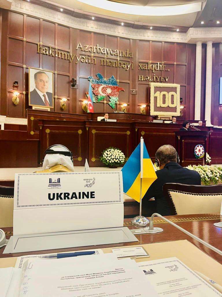 Заступниця Голови Верховної Ради України Олена Кондратюк виступила на Спеціальній сесії Міллі Меджлісу Азербайджанської Республіки, присвяченій 100-річчю від дня народження Гейдара Алієва.