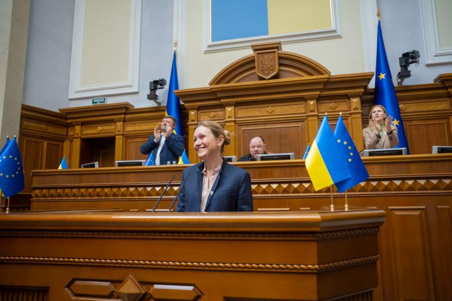 Як європейка, я відчуваю велику гордість, що ваше європейське прагнення є однією з рушійних сил української мужності, якою захоплюється світ. Бо реформуючись, модернізуючи свої структури, борючись з корупцією, Україна не ухвалює закони заради відповідності тому чи іншому, продиктованому ззовні, критерію членства. Вона робить це для себе й заради долі, яку вона для обрала. Перетворюючись, вона міцнішає, стає ефективнішою та потужнішою, збагачується й посідає місце, яке належить їй у ХХІ столітті – місце великої нації з давньою історією, загартованою у випробуваннях і сповненою рішучості відігравати свою роль у складі Європейського Союзу й у міжнародному співтоваристві.