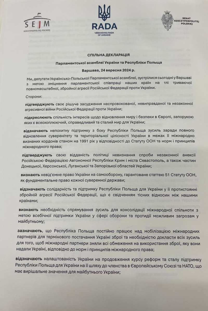 - Зазначають, що Республіка Польща постійно працює над мобілізацією міжнародних партнерів для термінового постачання Україні зброї та необхідністю докласти всіх зусиль для того, щоб міжнародні партнери зняли всі обмеження на використання зброї, яку вони надали Україні, відповідно до норм і принципів міжнародного права;- Відзначають налаштованість України на продовження курсу реформ та сталу підтримку Республіки Польща для України на її шляху до членства в Європейському Союзі та НАТО, що має вирішальне значення для майбутнього України.