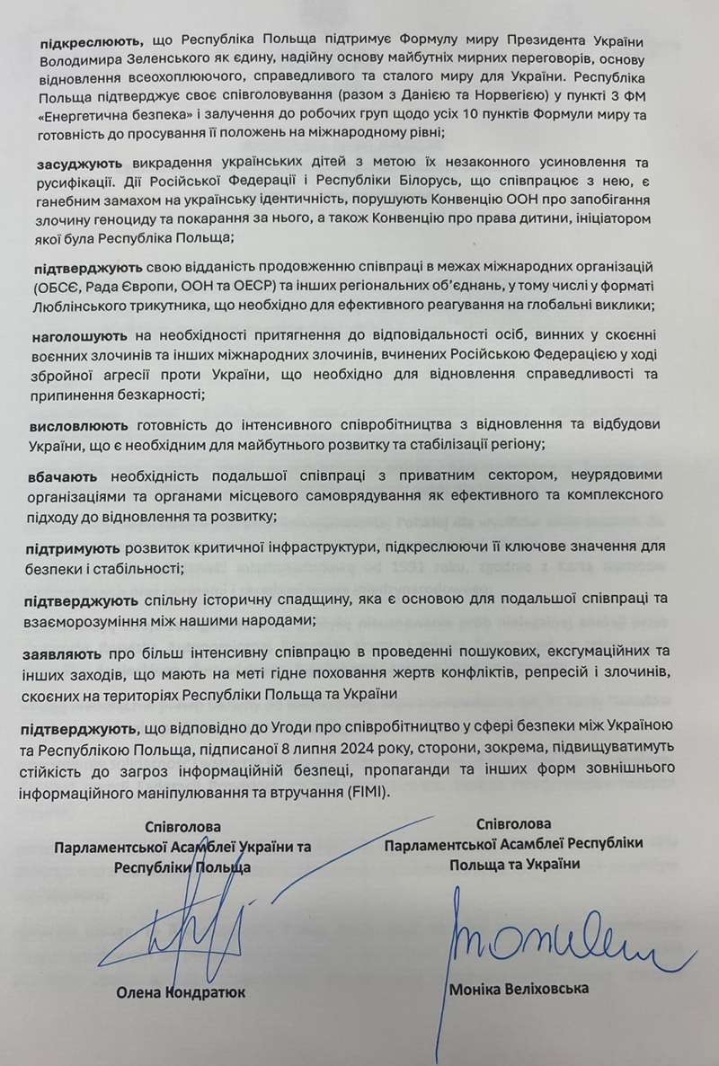 - Засуджують викрадення українських дітей з метою їх незаконного усиновлення та русифікації. Такі дії рф та Республіки Білорусь, що співпрацює з нею, є ганебним замахом на українську ідентичність, порушують Конвенцію ООН про запобігання злочину геноциду та покарання за нього, а також Конвенцію про права дитини, ініціатором якої була Республіка Польща.