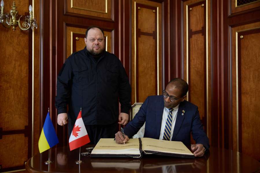 Після зустрічі Голова Верховної Ради України Руслан Стефанчук та Спікер Палати громад Парламенту Канади Грег Фергюс зробили спільну заяву для преси.
