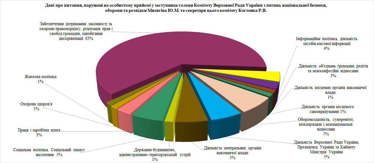 Під час особистого прийому відвідувачі порушили 79 питань. Найактуальнішими з них виявилися питання забезпечення дотримання законності та охорони правопорядку, реалізації прав і свобод громадян, запобігання дискримінації, обороноздатності, суверенітету, міждержавних і міжнаціональних відносин, соціальної політики та соціального захисту населення, діяльності Верховної Ради, Президента України, Кабінету Міністрів та центральних органів виконавчої влади.