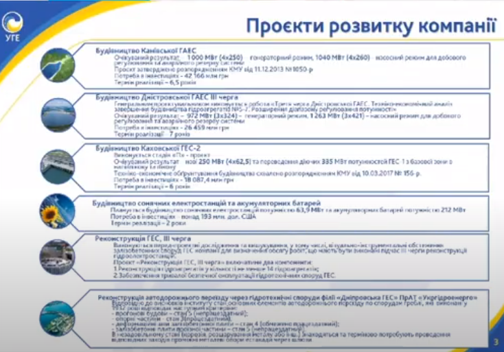 Згідно зі стратегією розвитку, зокрема, планується: будівництво Канівської ГАЕС на чотири агрегати по 260 МВт (зараз є проєкт); продовження будівництва трьох агрегатів Дністровської ГАЕС - III черга; будівництво Каховської ГЕС-2. Також передбачено будівництво сонячних електростанцій та акумуляторних батарей і реконструкція 15 агрегатів та інфраструктури.