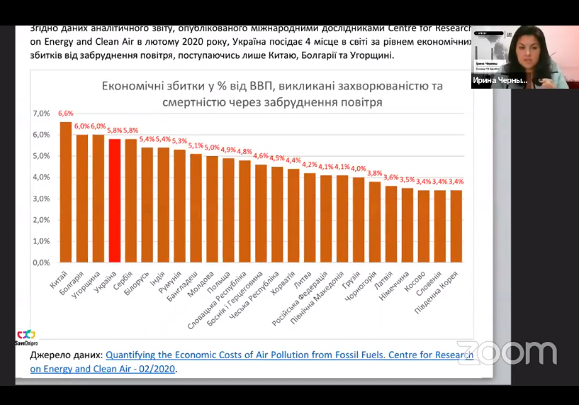 За її словами, 85% населення України проживає у місцях, де невідповідна якість повітря може впливати на здоров’я. Теплоенергетичні об’єкти створюють недопустимі карцерогенні ризики для населення, водночас, до оцінки їх впливу на навколишнє середовище необхідно підходити індивідуально.