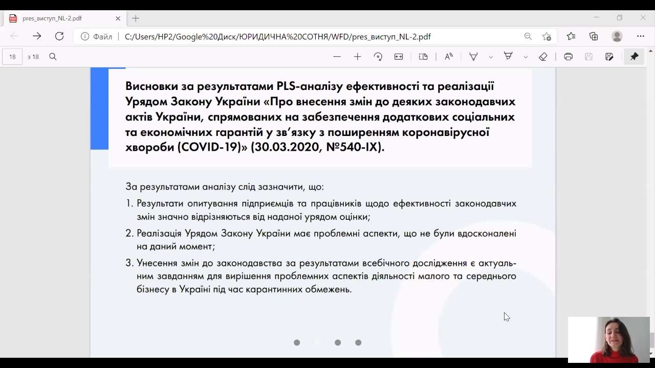Представниця громадського об’єднання «Юридична сотня» Вікторія Олійник у своїй доповіді поінформувала про проблеми, які піднімали абоненти «гарячої лінії» під час карантину. Вони, зокрема, стосувались транспортних обмежень, правил продаж, процедури отримання допомоги по безробіттю, пільг для підприємців, додатку «Дія».