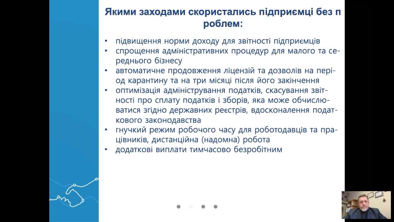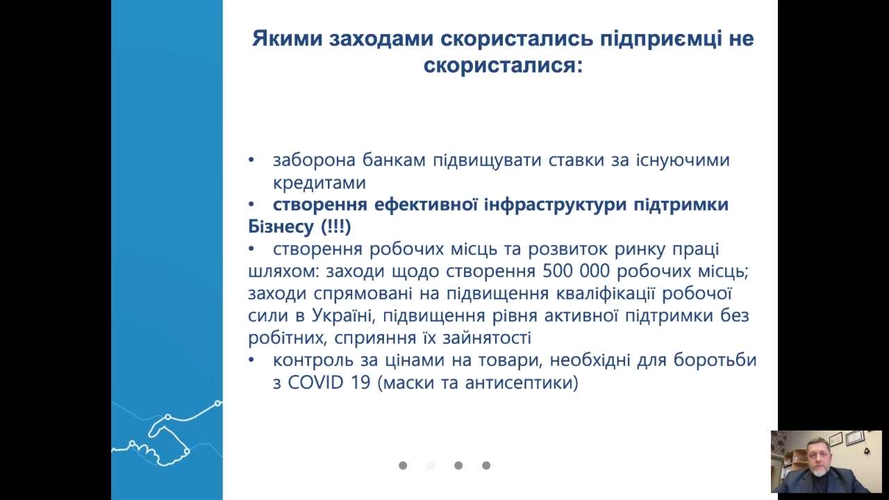 Учасники засідання обговорили ефективність й вплив на функціонування бізнесу та на умови праці заходів, що були запроваджені для підтримки малого і середнього бізнесу та працівників у цій сфері в умовах карантину.
