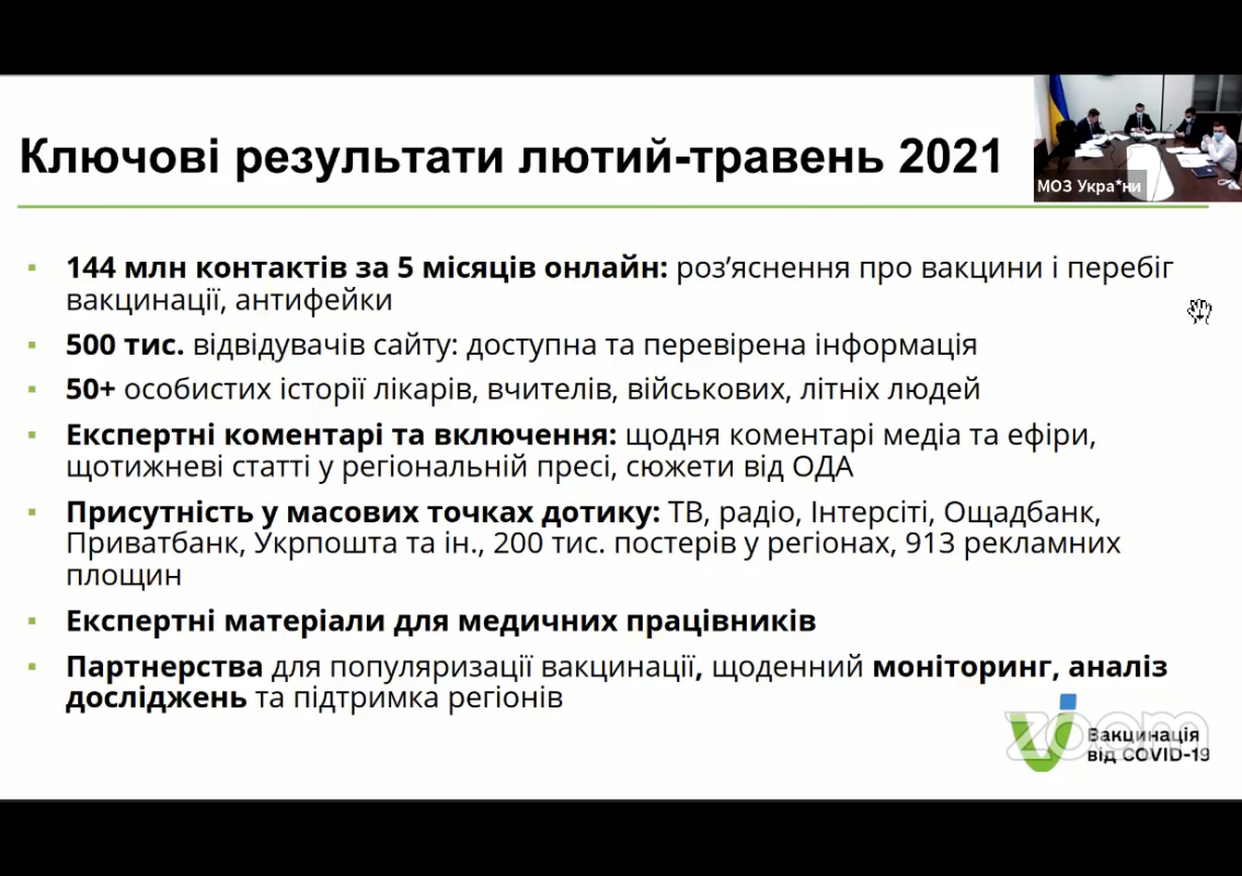 Заступник Міністра зауважив, що наразі необхідна допомога у формуванні партнерства при розміщенні інформаційних матеріалів. Зокрема, необхідно вирішити питання використання соціальних квот для промоції вакцинації та активізувати роботу в регіонах.