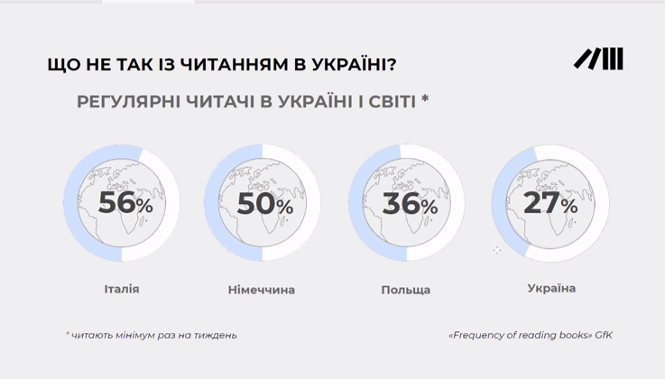«Сфера книги вважається сферою культури, а не розвитку держави. Зараз ми маємо шанс поставити все на належний рівень і отримати державну підтримку для розвитку сфери та розвитку української держави. Адже в Україні ситуація із читанням негативна. До прикладу, в Італії вдвічі більше постійних читачів, ніж у нас», - розповіла Олександра Коваль.