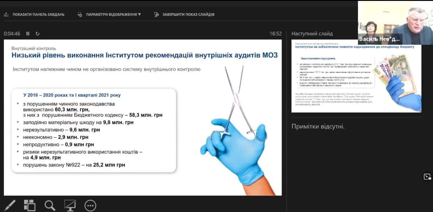 Результати аудиту представив член Рахункової палати Василь Невідомий, який поінформував про ряд суттєвих недоліків у роботі Інституту протягом 2018-2020 років та І кварталу 2021 року.