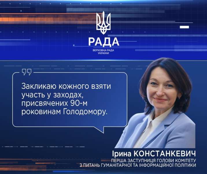 «Закликаю кожного взяти участь у заходах, присвячених 90-м роковинам Голодомору. Це жахливі сторінки нашої історії: ми маємо про них пам‘ятати, маємо гідно вшанувати пам‘ять про загиблих, замордованих», - акцентує перша заступниця голови Комітету Ірина Констанкевич.
