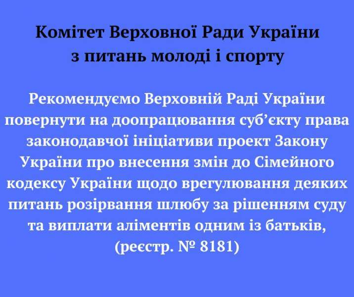 Комітет Верховної Ради України з питань молоді і спорту рекомендував Верховній Раді України повернути на доопрацювання суб’єкту права законодавчої ініціативи проект Закону України про внесення змін до Сімейного кодексу України щодо врегулювання деяких питань розірвання шлюбу за рішенням суду та виплати аліментів одним із батьків, (реєстр. №8181), поданий народним депутатом України Славицькою А.К. та іншими народними депутатами України.