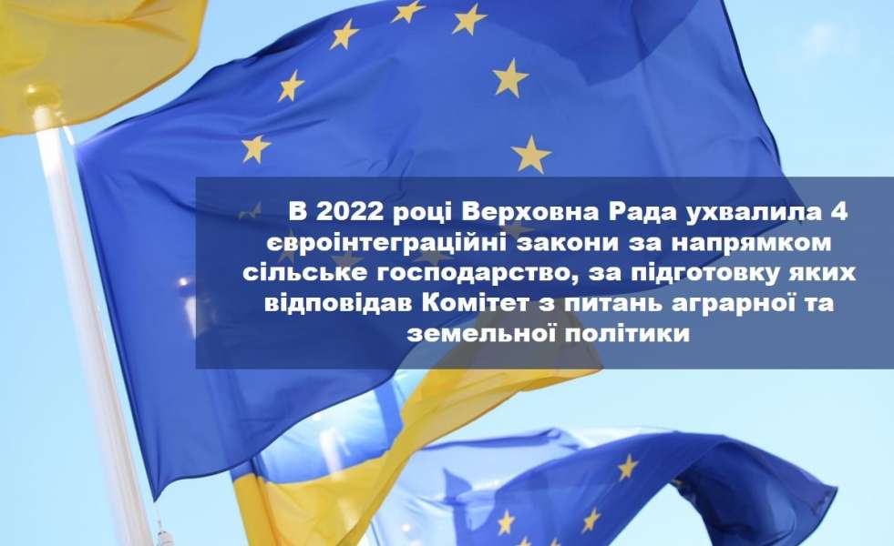 У 2022 році Верховна Рада України ухвалила чотири євроінтеграційні закони за напрямком сільське господарство, за підготовку яких відповідав Комітет з питань аграрної та земельної політики.