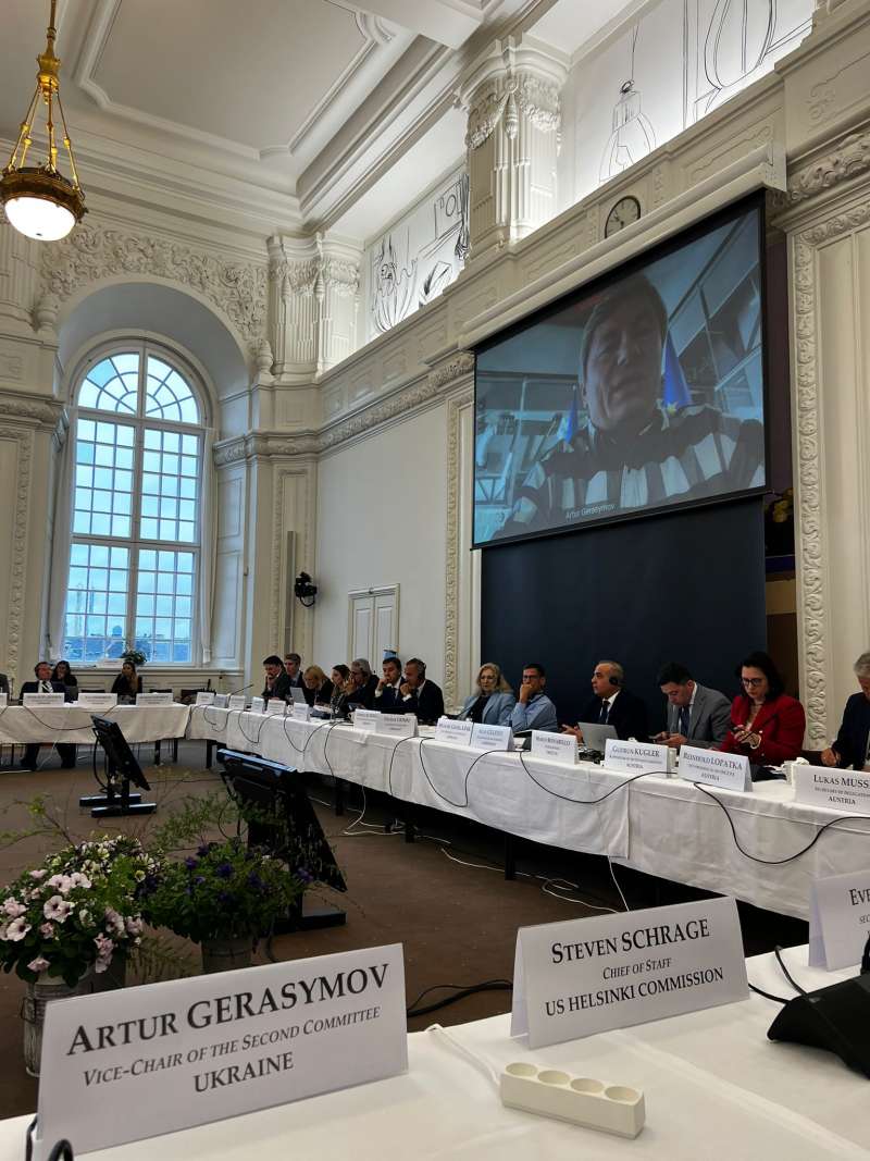 Заступник Керівника Української парламентської делегації Артур Герасимов повідомив присутніх про безпекову ситуацію в Україні, пріоритети діяльності Української делегації в Асамблеї, а також закликав підтримати внесення змін до Правил процедури ПА ОБСЄ стосовно припинення повноважень членів делегації держави-агресора, створення спеціального підкомітету ПА ОБСЄ щодо України, а також резолюцію, яку планує представити Українська парламентська делегація.