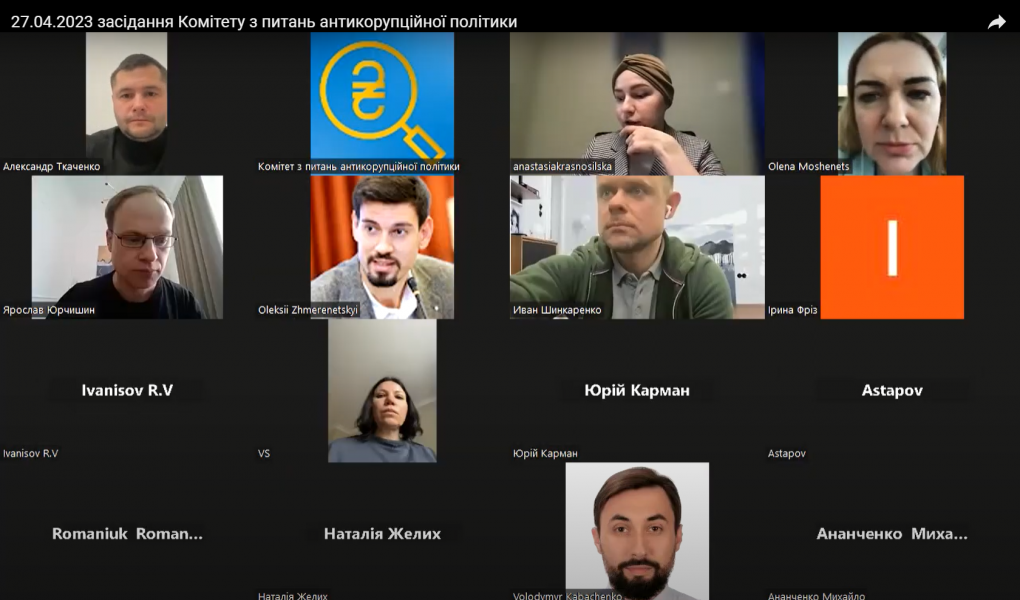 У четвер, 27 квітня 2023 року відбулось засідання Комітету з питань антикорупційної політики у режимі відеоконференції, під головуванням Голови Комітету Анастасії Радіної.