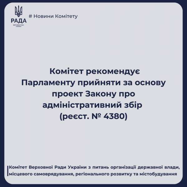 Комітет з питань організації державної влади, місцевого самоврядування, регіонального розвитку та містобудування на своєму засіданні, яке відбулось 20 липня цього року рекомендував Парламенту прийняти за основу проект Закону про адміністративний збір (реєст. № 4380)