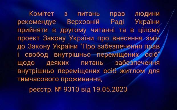 Комітет Верховної Ради України з питань прав людини, деокупації та реінтеграції тимчасово окупованих територій України, національних меншин і міжнаціональних відносин рекомендує Парламенту прийняти у другому читанні та в цілому проект Закону України про внесення змін до Закону України «Про забезпечення прав і свобод внутрішньо переміщених осіб» щодо деяких питань забезпечення внутрішньо переміщених осіб житлом для тимчасового проживання, реєстр. № 9310 від 19.05.2023.
