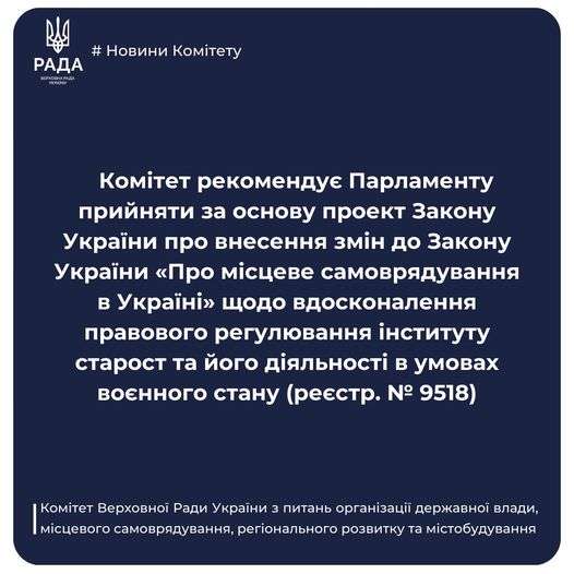 Комітет Верховної Ради України з питань державної влади, місцевого самоврядування, регіонального розвитку та містобудування рекомендує Парламенту прийняти за основу проект Закону України про внесення змін до Закону України «Про місцеве самоврядування в Україні» щодо вдосконалення правового регулювання інституту старост та його діяльності в умовах воєнного стану (реєстр. № 9518).