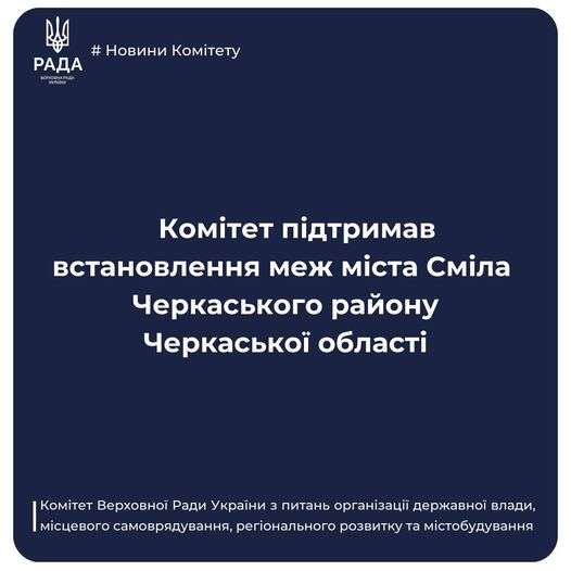 Комітет Верховної Ради України з питань організації державної влади, місцевого самоврядування, регіонального розвитку та містобудування розглянув на своєму засіданні 18 серпня 2023 року проект Постанови Верховної Ради України про встановлення меж міста Сміла Черкаського району Черкаської області (реєстр. № 7715), поданий Кабінетом Міністрів України.
