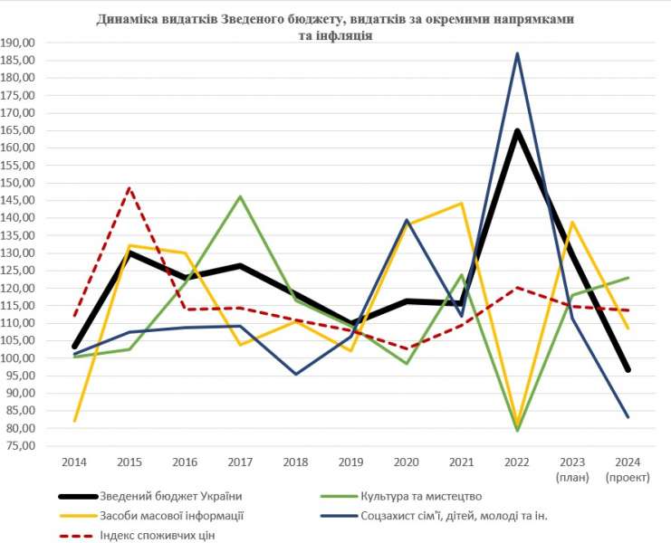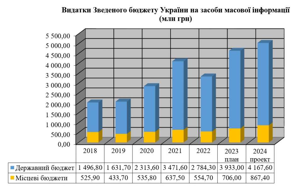 У Зведеному бюджеті України 2022 року проведено номінальних видатків на засоби масової інформації на 18,74% менше, ніж у 2021 році. У 2023 році видатки на медіа мають зрости на 38,93%, проєктом Зведеного бюджету України на 2024 рік передбачено подальше їхнє зростання на 8,54%.