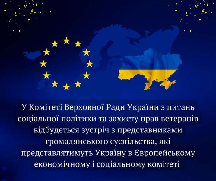 У Комітеті Верховної Ради України з питань соціальної політики та захисту прав ветеранів планується зустріч народних депутатів України, представників Офісу Президента України, Кабінету Міністрів України з членами Української сторони Платформи громадянського суспільства Україна – ЄС, які розпочнуть свою роботу в Європейському економічному і соціальному комітеті від імені України вже на початку 2024 року.