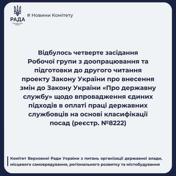 У Комітеті з питань організації державної влади, місцевого самоврядування, регіонального розвитку та містобудування відбулося четверте засідання Робочої групи з доопрацювання та підготовки до другого читання проекту Закону України про внесення змін до Закону України «Про державну службу» щодо впровадження єдиних підходів в оплаті праці державних службовців на основі класифікації посад (реєстр. №8222).
