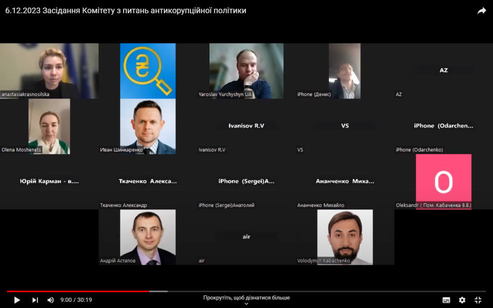 Сьогодні, 06 грудня 2023 року відбулось засідання Комітету з питань антикорупційної політики у режимі відеоконференції, під головуванням Голови Комітету Анастасії Радіної.