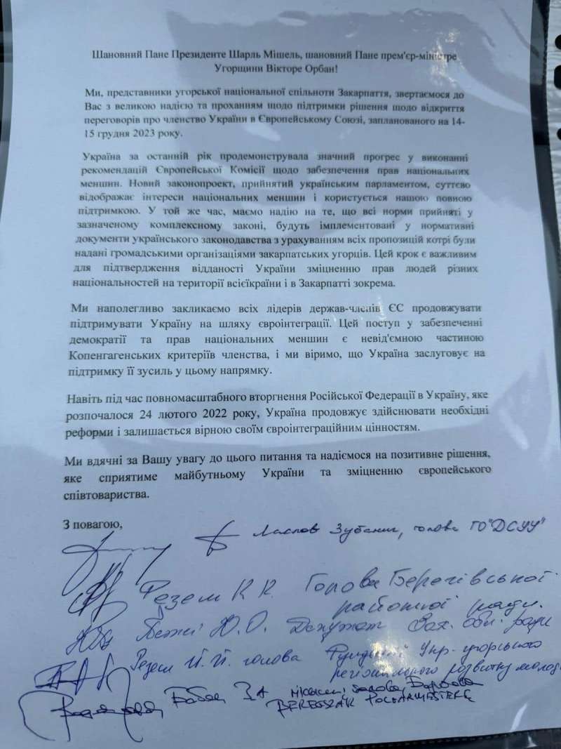 Також народна депутатка повідомила, що під час зустрічі представники угорських національних спільнот Закарпаття опублікували відкрите звернення до Голови Європейської ради Шарля Мішеля та Прем'єр-міністра Угорщини Віктора Орбана, закликали підтримати рішення щодо відкриття перемовин про членство України в ЄС під час засідання Євроради, яке відбудеться 14-15 грудня 2023 року. Аналогічне звернення до Премʼєр-міністра Словаччини зробили і лідери словацької національної спільноти.