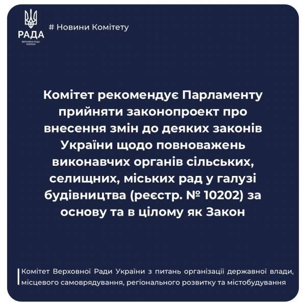 Комітет з питань організації державної влади, місцевого самоврядування, регіонального розвитку та містобудування рекомендує Парламенту прийняти законопроект про внесення змін до деяких законів України щодо повноважень виконавчих органів сільських, селищних, міських рад у галузі будівництва (реєстр. №10202) за основу та в цілому як Закон.