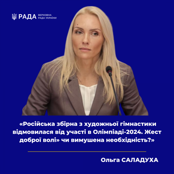 Разом повинні зробити так, щоб не лише гімнасти, але будь-хто з росіян і представників білорусі не потрапив на Олімпіаду-2024», — зазначає народна депутатка України, Голова підкомітету з питань спорту вищих досягнень і спортивної діяльності Ольга Саладуха.