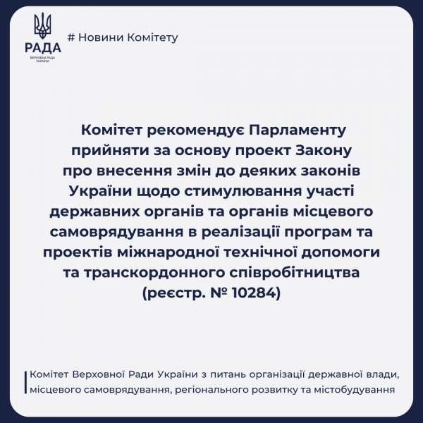 Законопроектом про внесення змін до деяких законів України щодо стимулювання участі державних органів та органів місцевого самоврядування в реалізації програм та проектів міжнародної технічної допомоги та транскордонного співробітництва (реєстр. №10284) передбачається внесення змін до законів України «Про державну службу» та «Про службу в органах місцевого самоврядування» з метою встановлення для державних службовців та посадових осіб місцевого самоврядування надбавки за додаткове навантаження у зв’язку з виконанням обов'язків за програмами та проектами міжнародної технічної допомоги та транскордонного співробітництва.