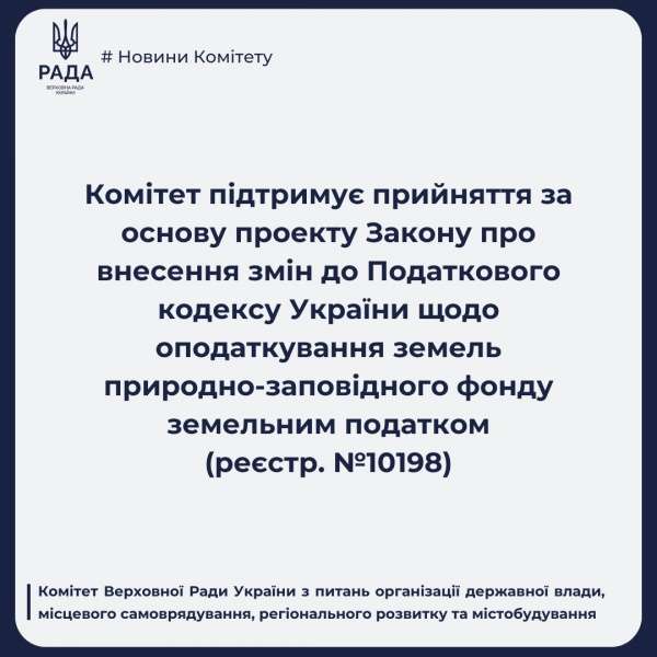 Комітет з питань організації державної влади, місцевого самоврядування, регіонального розвитку та містобудування пропонує Комітету з питань фінансів, податкової та митної політики, визначеного головним з підготовки та опрацювання проекту Закону про внесення змін до Податкового кодексу України щодо оподаткування земель природно-заповідного фонду земельним податком №10198, рекомендувати Парламенту прийняти його за основу за умови обов’язкового доопрацювання під час підготовки до другого читання з урахуванням надання відповідним територіальним громадам фінансових компенсаторів.