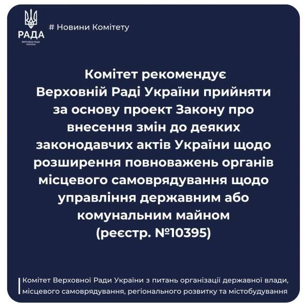 Комітет Верховної Ради України з питань організації державної влади, місцевого самоврядування, регіонального розвитку та містобудування розглянув проект Закону про внесення змін до деяких законодавчих актів України щодо розширення повноважень органів місцевого самоврядування щодо управління державним або комунальним майном (реєстр. №10395).