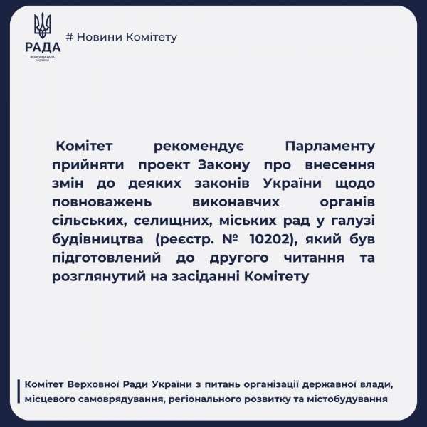 Комітет з питань організації державної влади, місцевого самоврядування, регіонального розвитку та містобудування розглянув підготовлений до другого читання проект Закону про внесення змін до деяких законів України щодо повноважень виконавчих органів сільських, селищних, міських рад у галузі будівництва (реєстр. №10202).