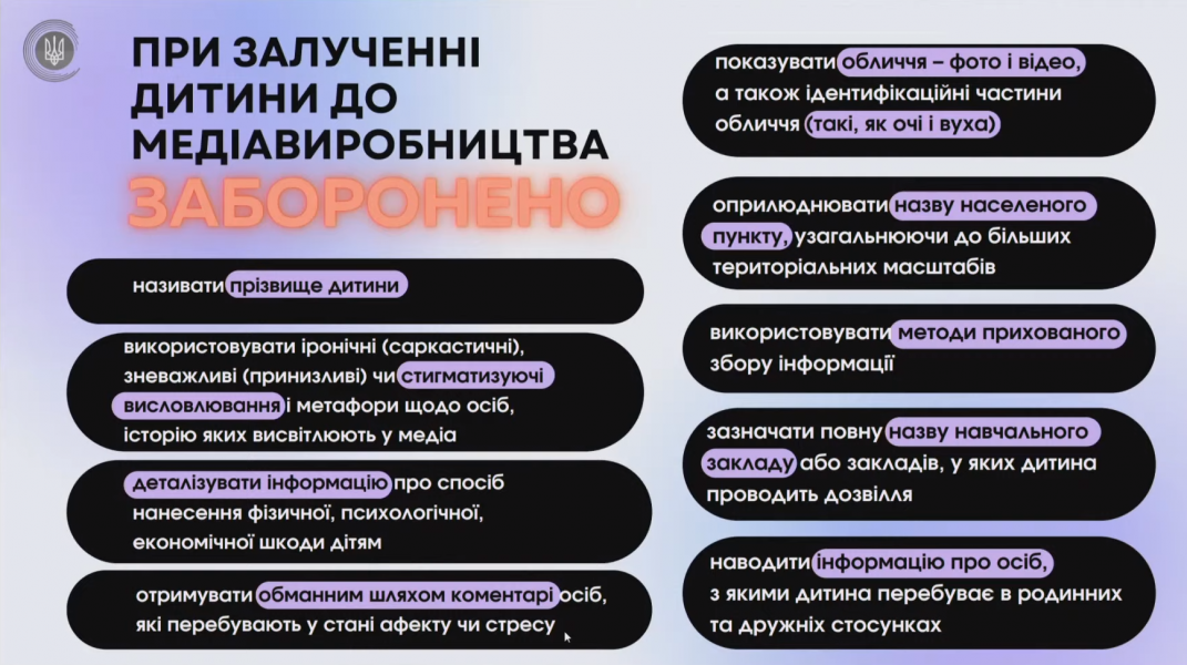 Радниця – уповноважена Президента Дар’я Герасимчук акцентувала, що журналісти у своїх матеріалах не мають розголошувати імена, міста проживання, місце навчання та іншу персональну інформацію про дітей і їхніх рідних, якщо це може зашкодити дитині.