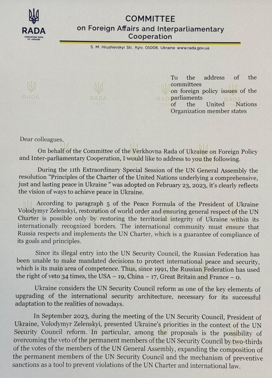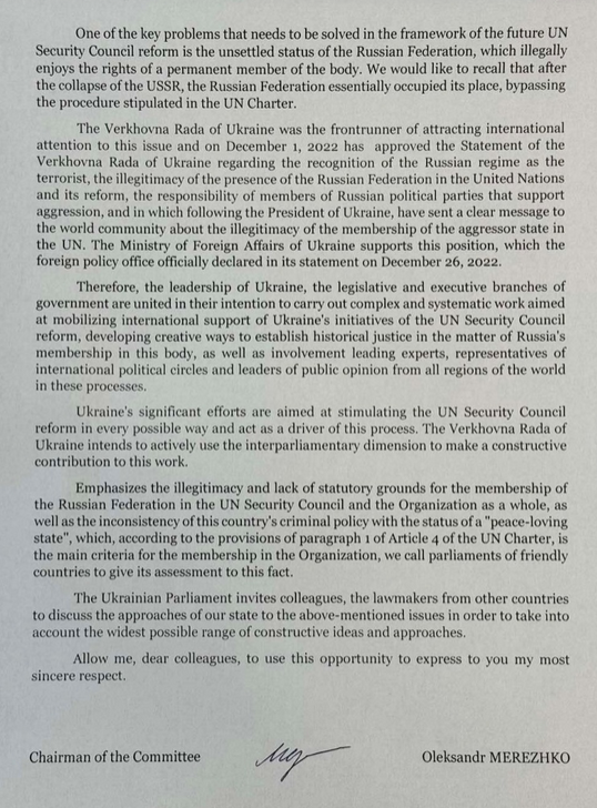 У цьому контексті Комітет звернувся до профільних комітетів з питань зовнішньої політики парламентів держав-членів ООН щодо реформування ООН та легітимності статусу російської федерації в Організації. У Зверненні наголошуються на зловживанні державою-агресором свого права вето як Постійного члена Ради Безпеки ООН та фактичну окупацію рф місця срср в обхід процедури, передбаченої Статутом ООН.