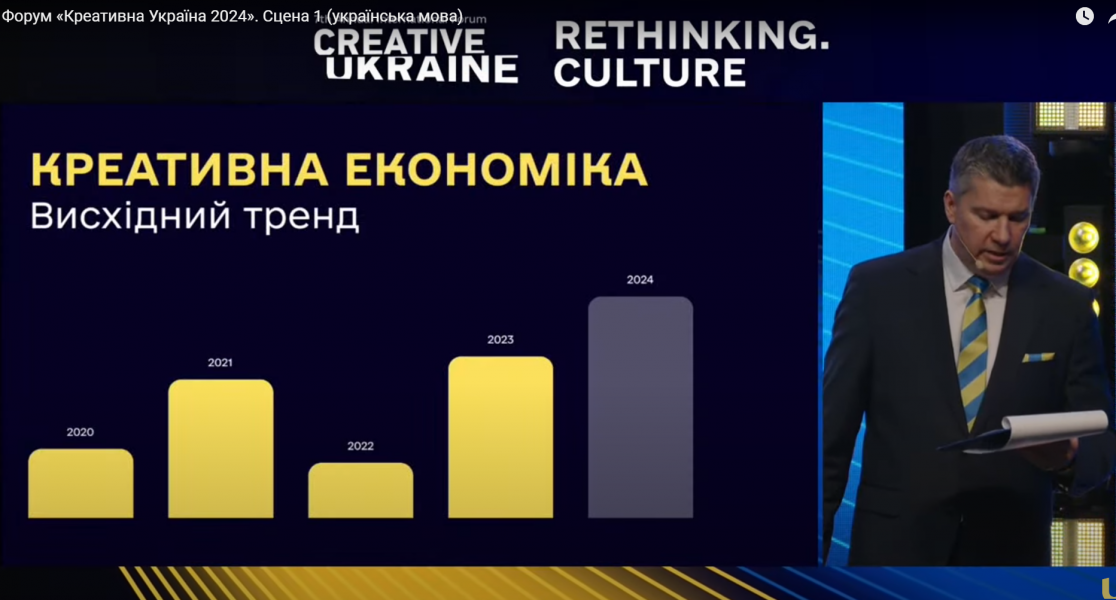 Закінчив презентацію Ростислав Карандєєв словами: «Звернімо увагу на економічну дохідність креативної індустрії останніх років. Так, зрозуміло, є падіння у 2022 році. Але вже 2023 рік нам показав висхідний тренд. І за нашими аналітичним даними, навіть незважаючи на виклики війни, на ті проблеми, які ми маємо щодня - із тривогами, із втратами, українська економіка перебудовується, і вже 2024 року ми розраховуємо на зростання економічної потужності цього важливого для нас сектору».