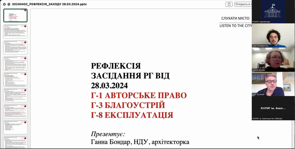 Доповіді супроводжувалися обговоренням та дискусіями стосовно необхідності врахування представлених результатів роботи підгруп при формуванні концепції Містобудівного кодексу України та розробці його проекту.