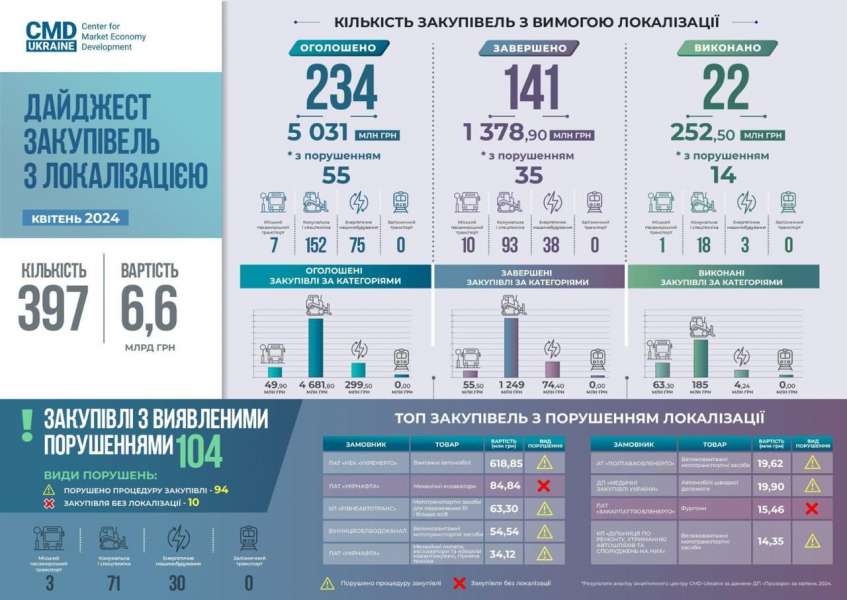 Загалом, 26% публічних закупівель з вимогою локалізації у квітні відбулись з порушеннями.