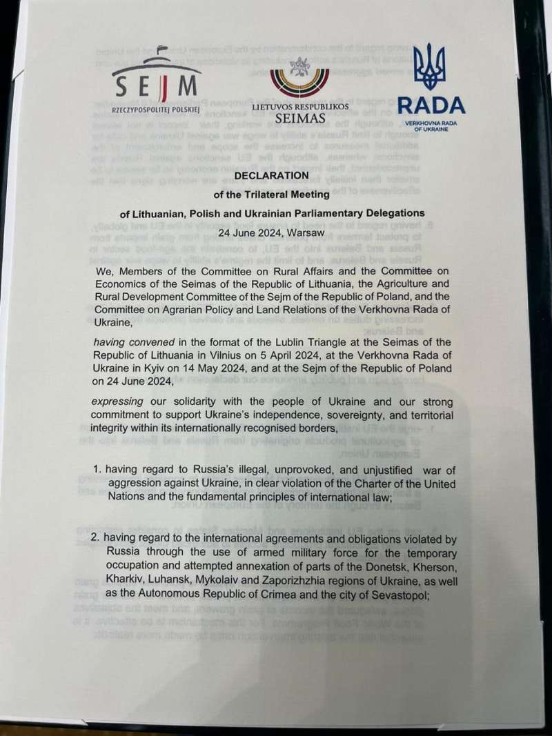 24 червня 2024 року у м. Варшава, Республіці Польща, в межах альянсу «Люблінський трикутник», відбулась третя тристороння зустріч Голови Комітету Верховної Ради України з питань аграрної та земельної політики Олександра Гайду та народних депутатів України – членів Комітету, Голови Комітету у справах села Сейму Республіки Литва Віктораса Пранцкетіса, Голови Комітету з економіки Сейму Литовської Республіки Казіса Старкявічюса та Голови Комітету з питань сільського господарства та розвитку села Сейму Республіки Польща Мирослава Малішевського.