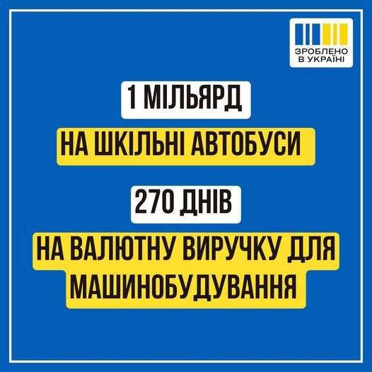 «Шкільні автобуси. Тут мова не тільки про те, що дітей треба доставляти до школи. Це безумовно важливо. А ще й про те, що виділені кошти завдяки політиці локалізації не будуть витрачені на імпорт. В Україні є 4 виробники шкільних автобусів – в Чернігові, Черкасах, Луцьку і Запоріжжі. Їх потужності щонайменше втричі перевищують наявний обсяг фінансування. Виробництво автобуса передбачає залучення від 20 до 200 інших українських виробників з усіх куточків країни.