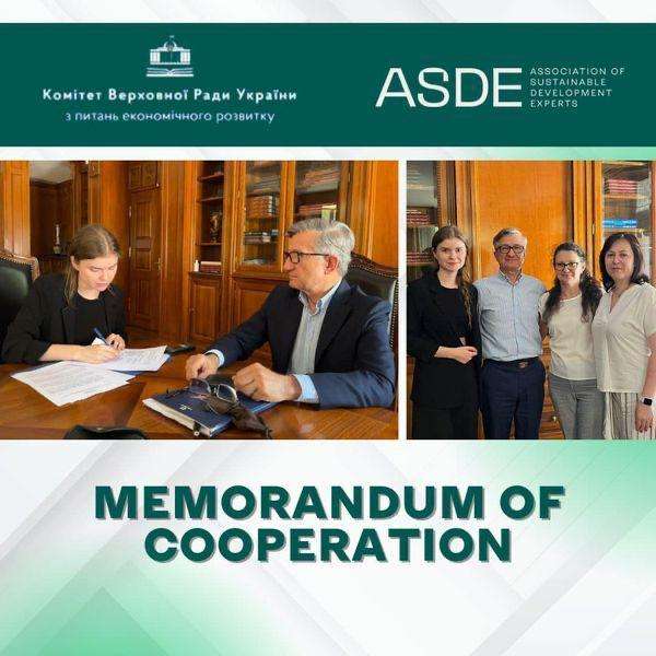 Комітет з питань економічного розвитку та Асоціація експертів зі сталого розвитку (АСДЕ) підписали Меморандум про співпрацю у сфері розробки і реалізації системи стратегічних та тактичних рішень для України, а також законодавчих ініціатив та пропозицій, спрямованих на досягнення прискореного економічного зростання країни, збільшення зайнятості та інноваційного розвитку, освітньої і науково-дослідної діяльності з метою реалізації Україною цілей сталого розвитку.