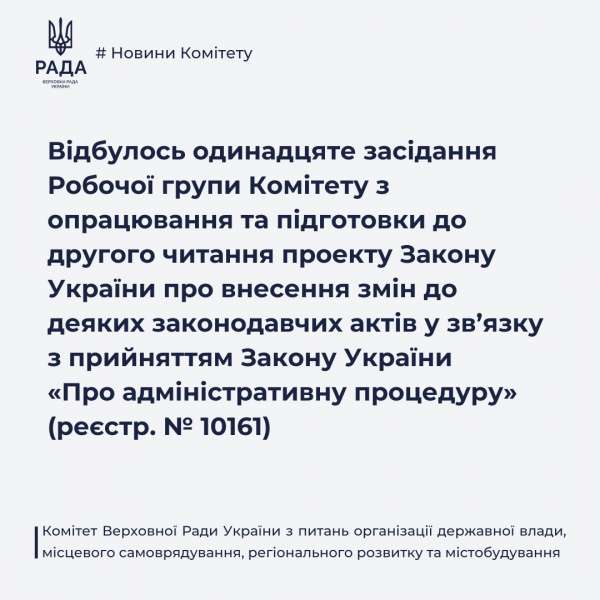 29 липня відбулося одинадцяте засідання Робочої групи Комітету з опрацювання та підготовки до другого читання проекту Закону України про внесення змін до деяких законодавчих актів у зв’язку з прийняттям Закону України «Про адміністративну процедуру» (реєстр. № 10161).