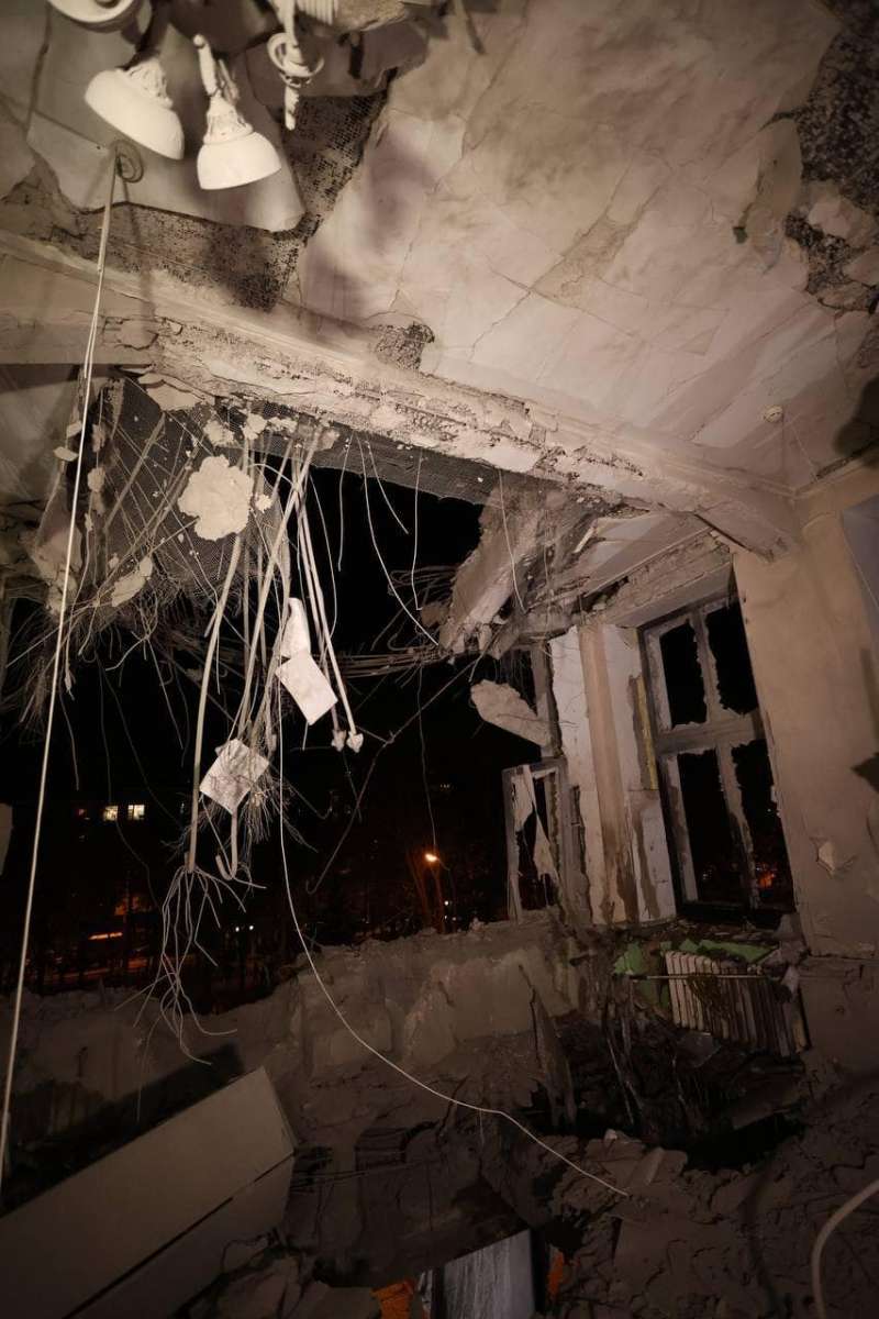 Знищене перекриття над третім поверхом, немає однієї стіни, розтрощено вікна.
