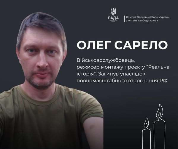 З глибоким сумом повідомляємо про чергову втрату серед медійної спільноти. На фронті, захищаючи Україну від російської агресії, загинув військовослужбовець, режисер монтажу проєкту «Реальна історія» Олег Сарело.